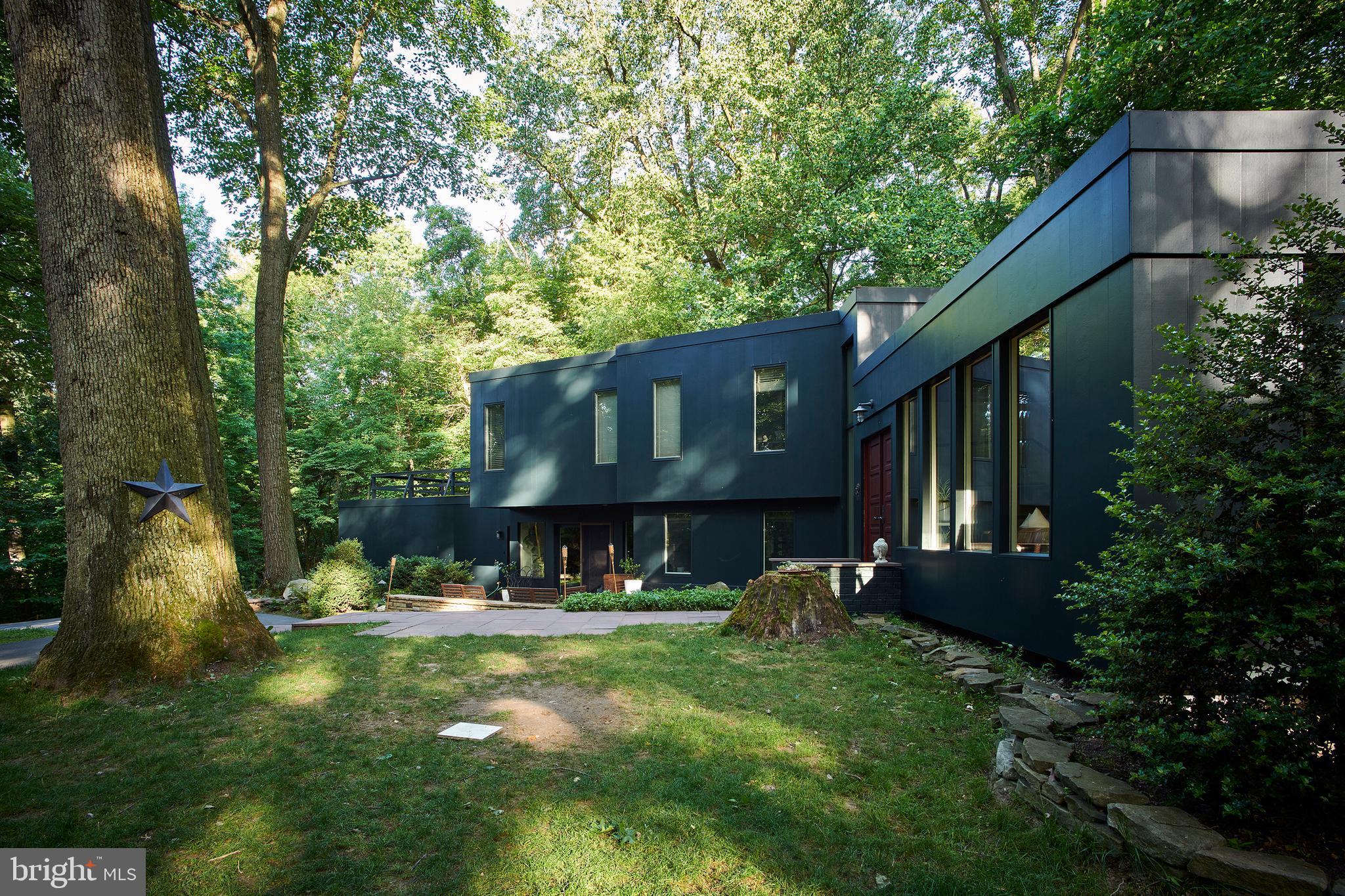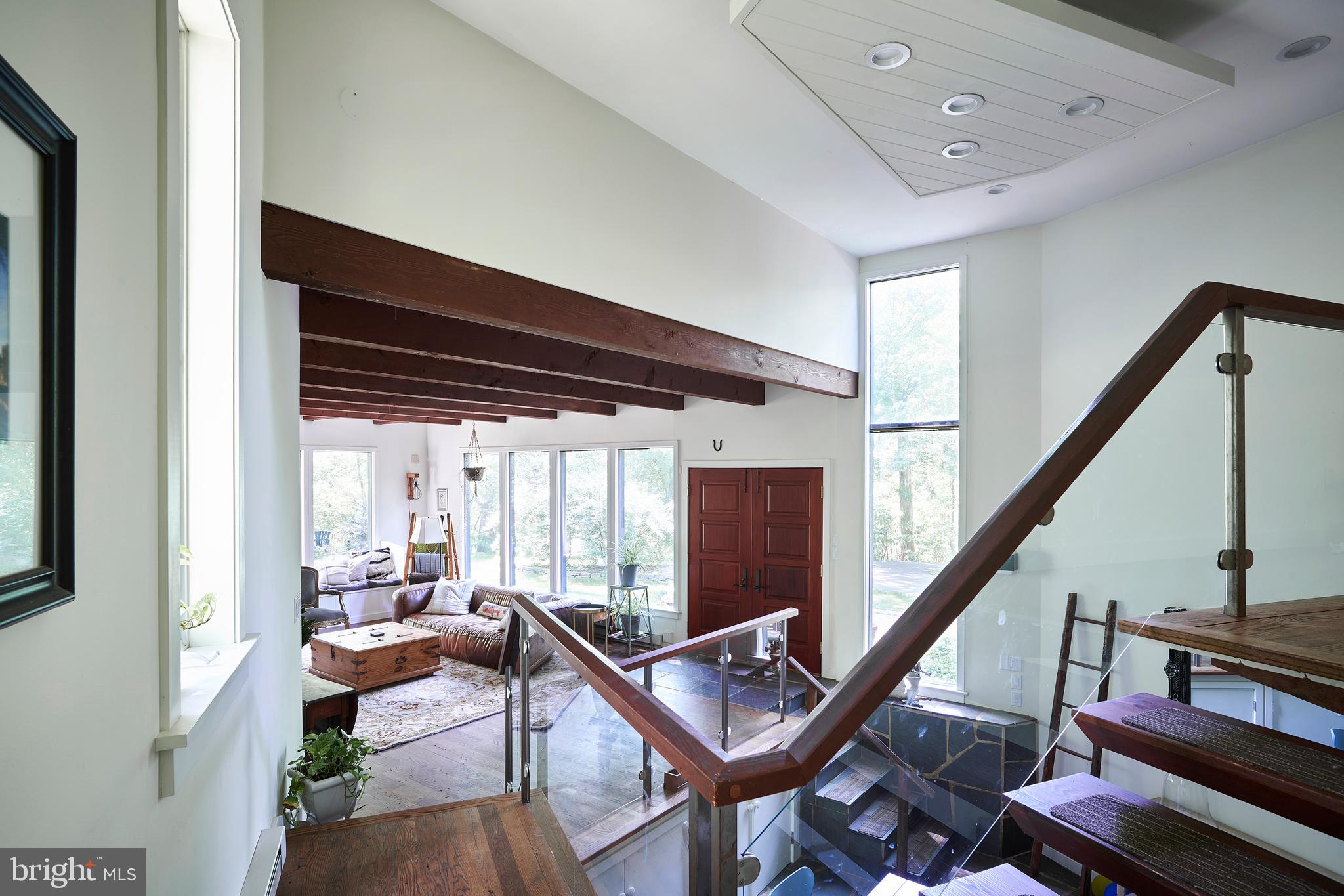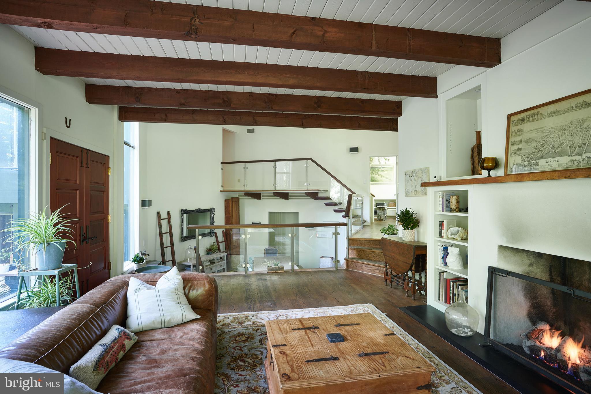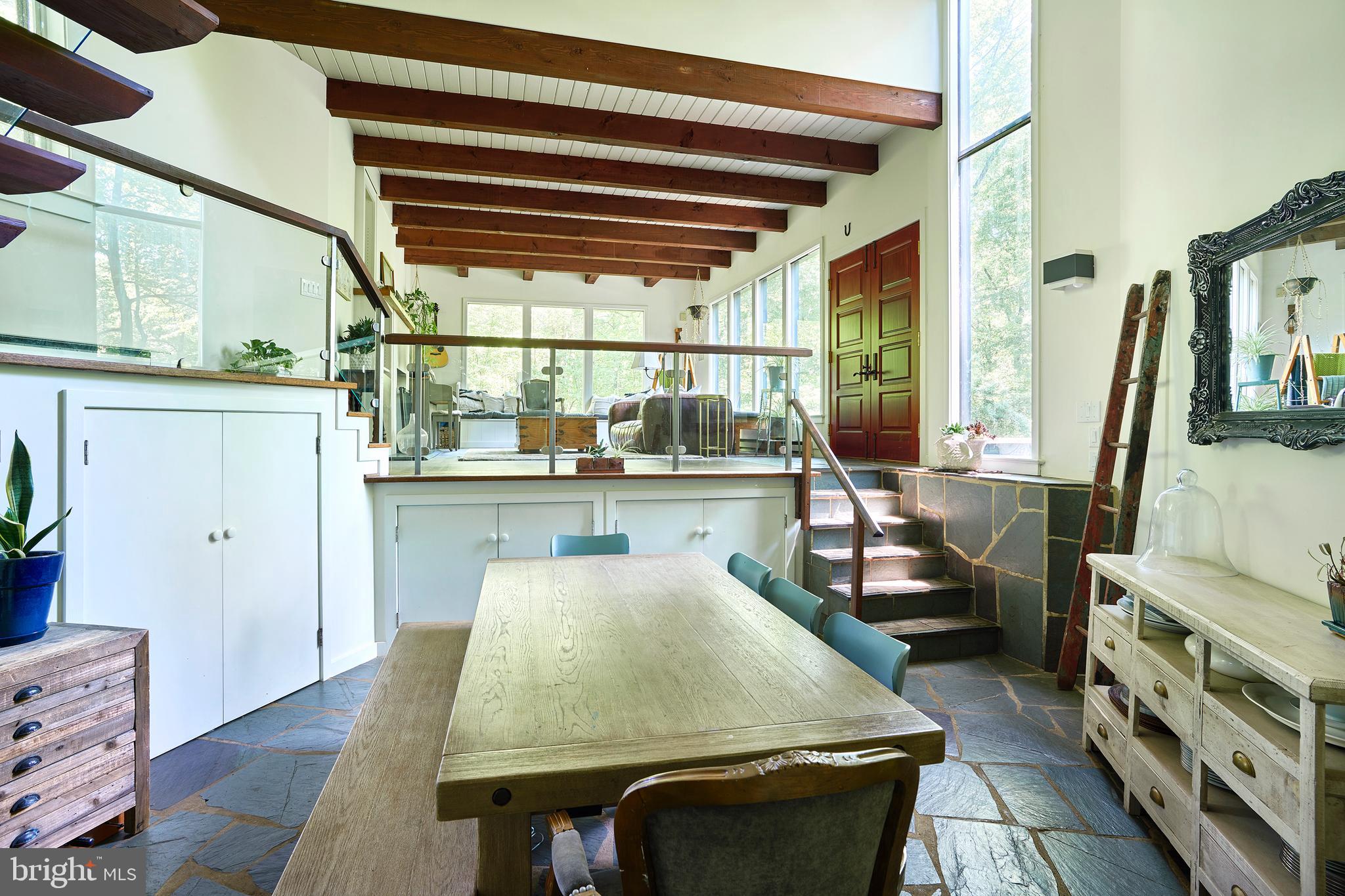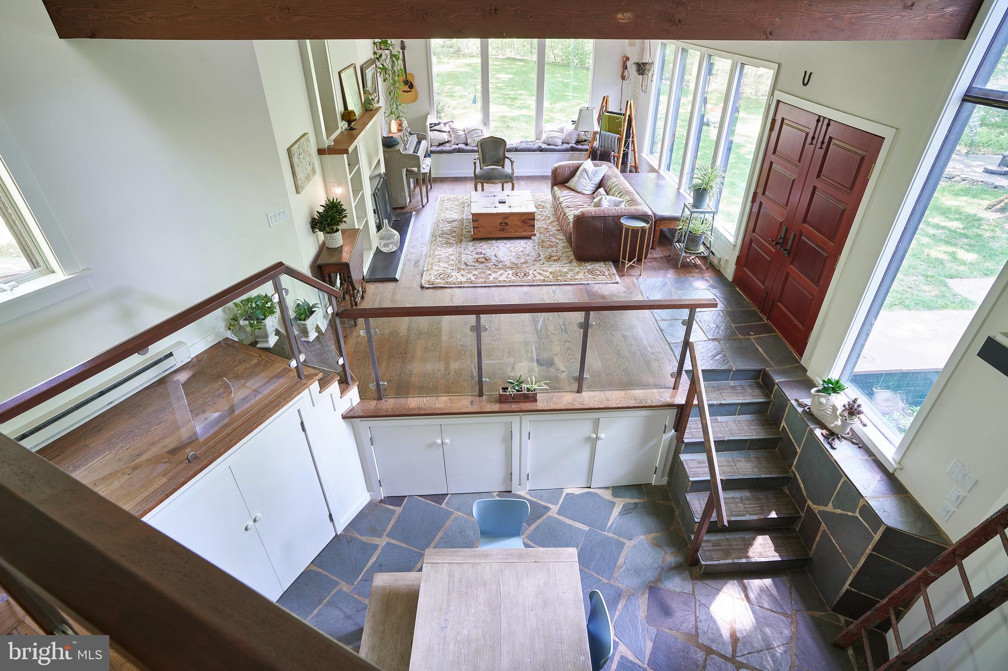 This ultra-private Mid-Century Modern home is beyond unique offering dramatic lines on the exterior with beautiful hardwood floors and a highly functional floor plan on the interior. You're greeted by solid Mahogany doors as you enter the bright and spacious living room with Rumford Fireplace(gas controlled including remote and thermostat setting), open to the 2 story dining room with fabulous floating staircase. The spectacular custom kitchen offers a large island with butcher block top, stainless farm sink, Quartz countertops, and stainless appliance suite. The open floor plan features a spacious family room, 24 x 16 with many built-ins and a spiral staircase (2nd stairway), plus a convenient half bath, guest room and laundry. Upstairs there are 4 bedrooms, an office, and 2 full baths including the primary bedroom suite. It's your own retreat with a walk-in closet, sitting area. The attached primary bathroom is finished with a lovely Santa Barbara pattern tile floor with large travertine tiled shower, a large soapstone walk-in shower as well as a separate soaking tub.
