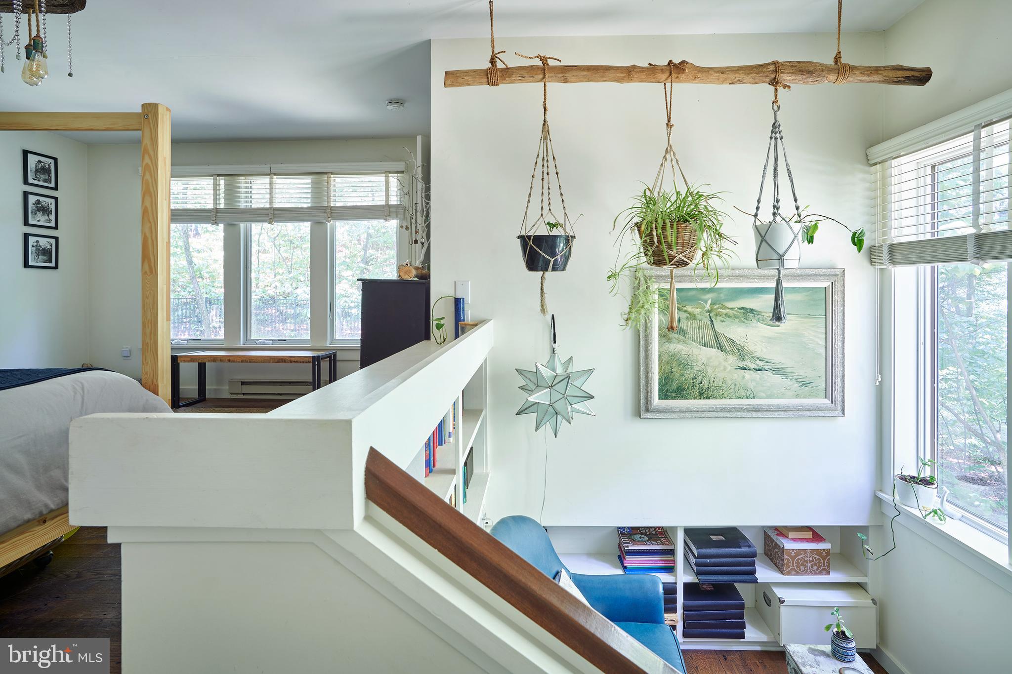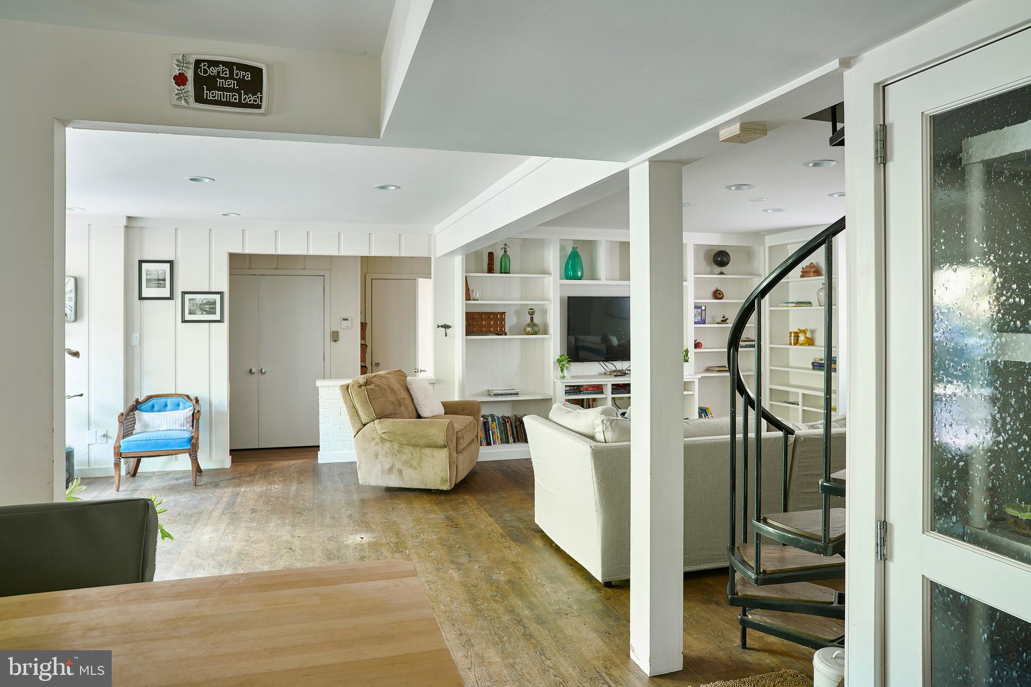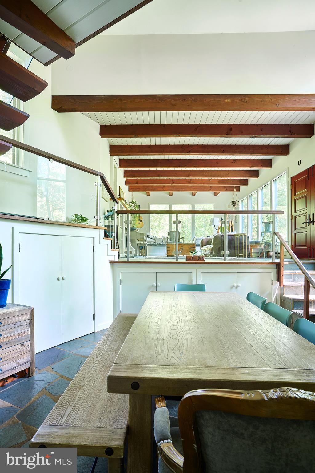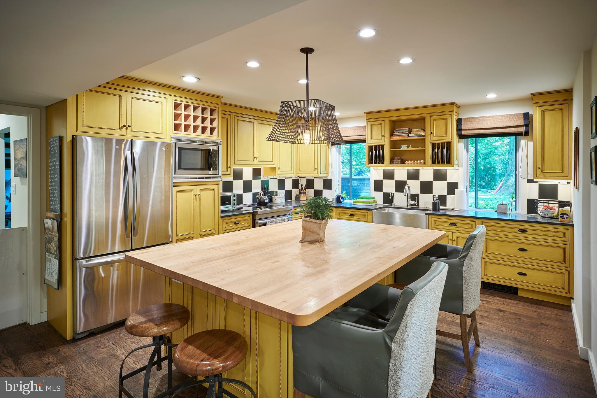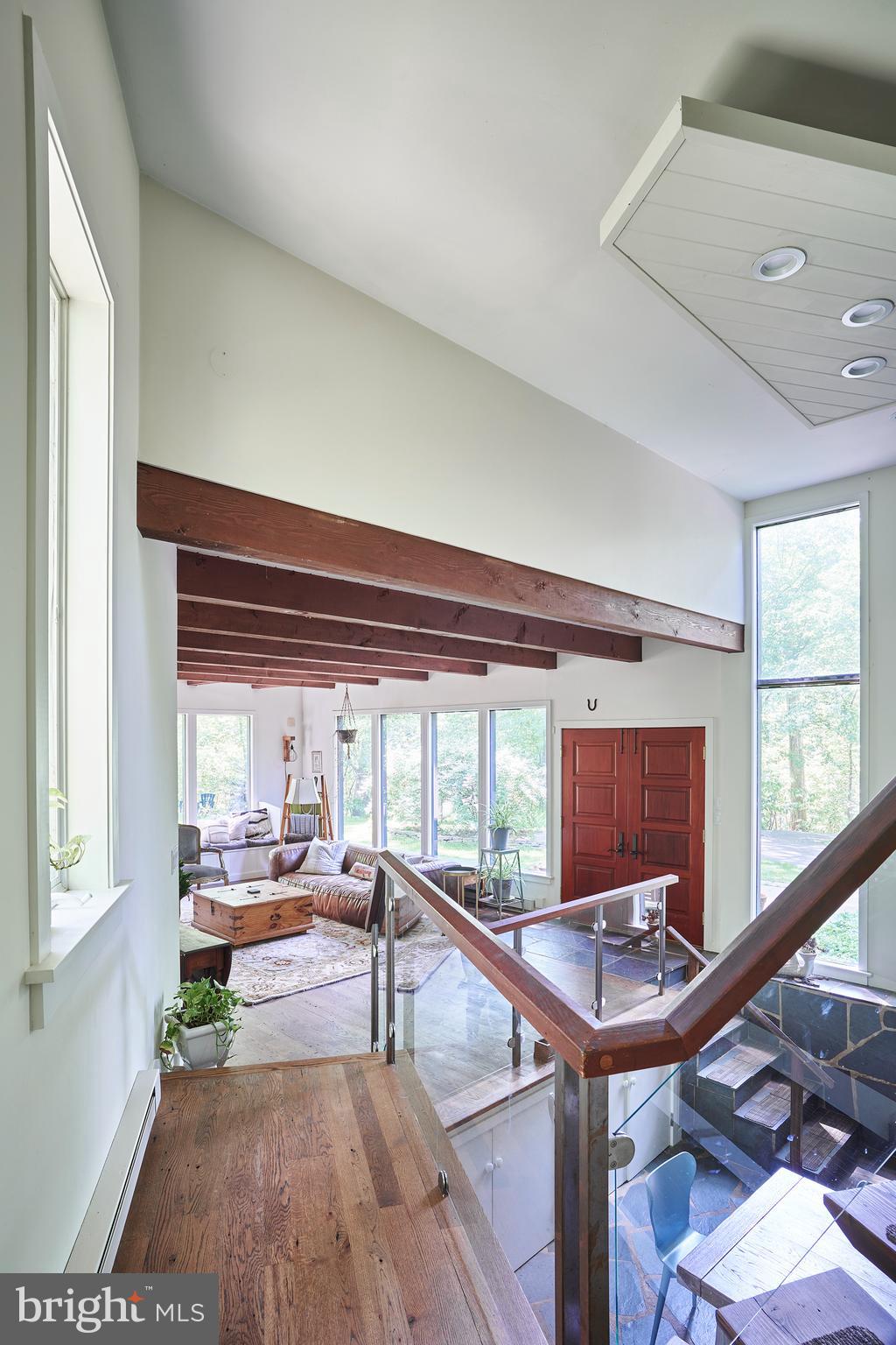 This ultra-private Mid-Century Modern home is beyond unique offering dramatic lines on the exterior with beautiful hardwood floors and a highly functional floor plan on the interior. You're greeted by solid Mahogany doors as you enter the bright and spacious living room with Rumford Fireplace(gas controlled including remote and thermostat setting), open to the 2 story dining room with fabulous floating staircase. The spectacular custom kitchen offers a large island with butcher block top, stainless farm sink, Quartz countertops, and stainless appliance suite. The open floor plan features a spacious family room, 24 x 16 with many built-ins and a spiral staircase (2nd stairway), plus a convenient half bath, guest room and laundry. Upstairs there are 4 bedrooms, an office, and 2 full baths including the primary bedroom suite. It's your own retreat with a walk-in closet, sitting area. The attached primary bathroom is finished with a lovely Santa Barbara pattern tile floor with large travertine tiled shower, a large soapstone walk-in shower as well as a separate soaking tub.