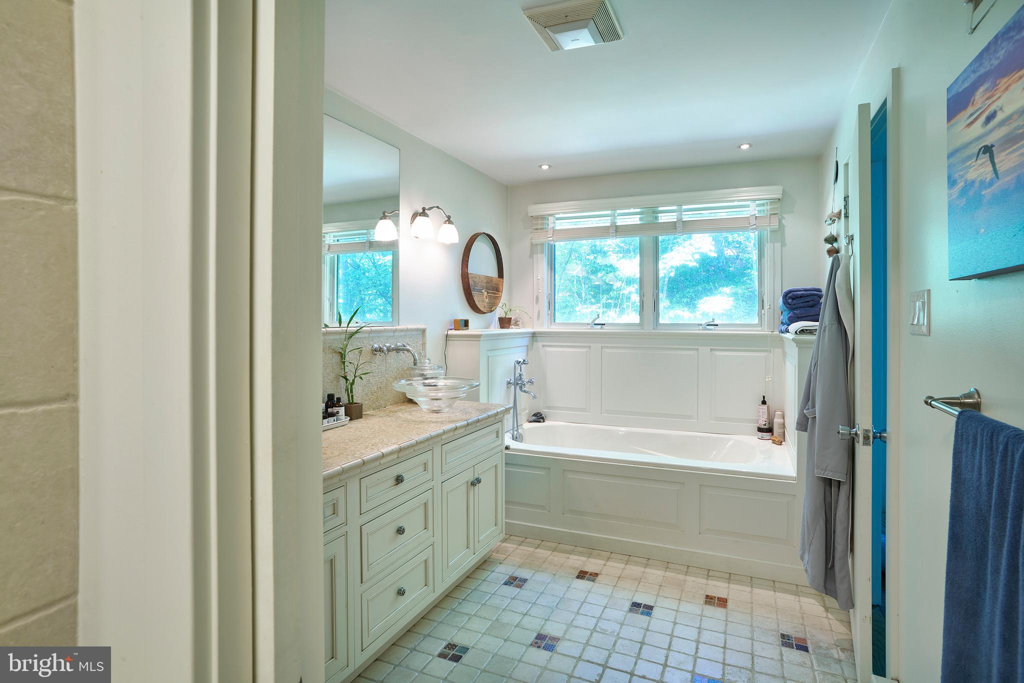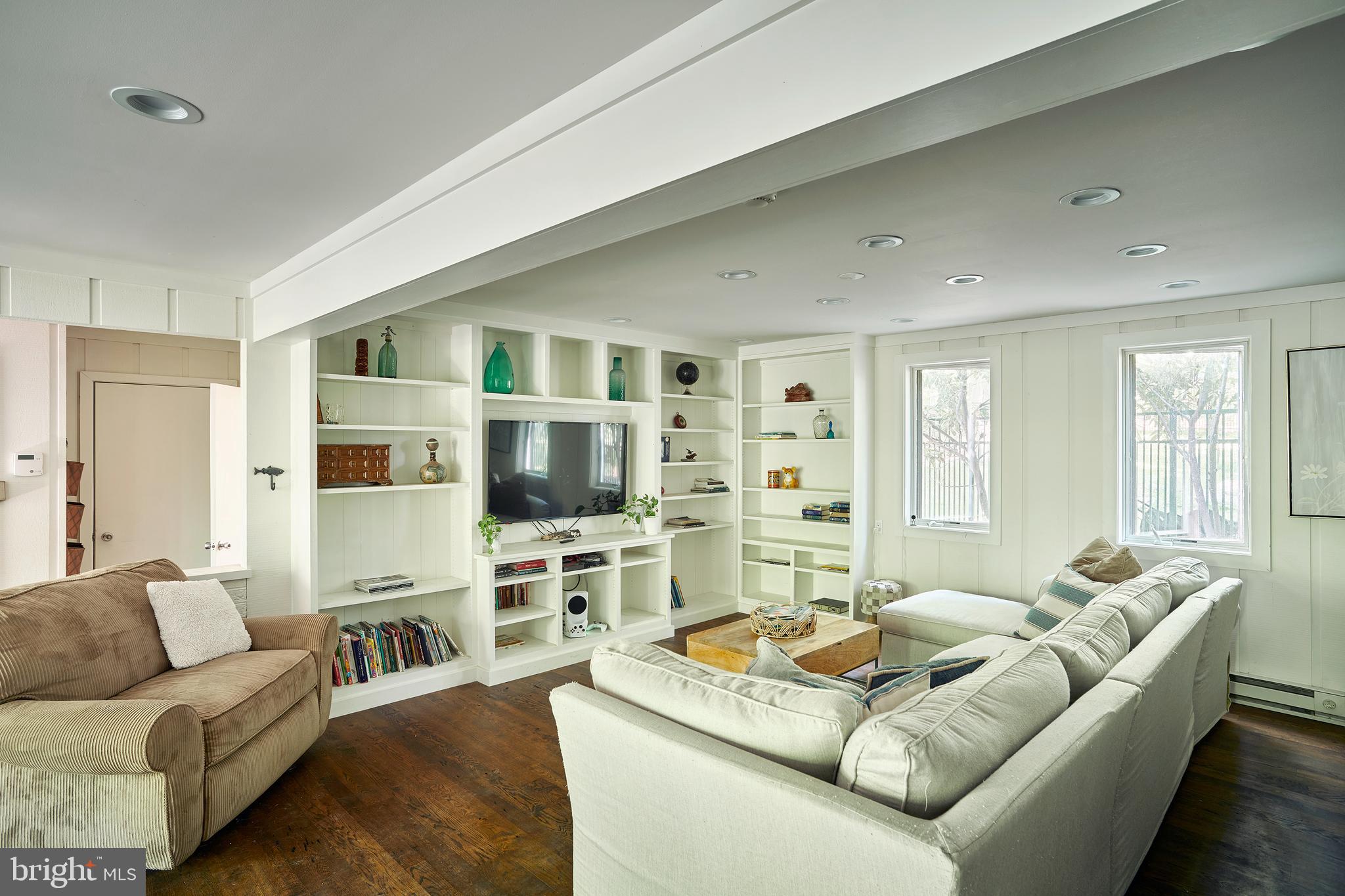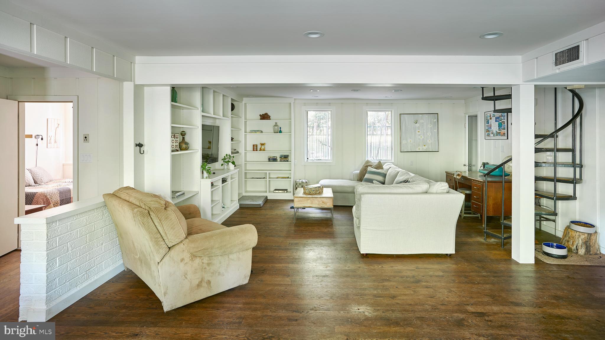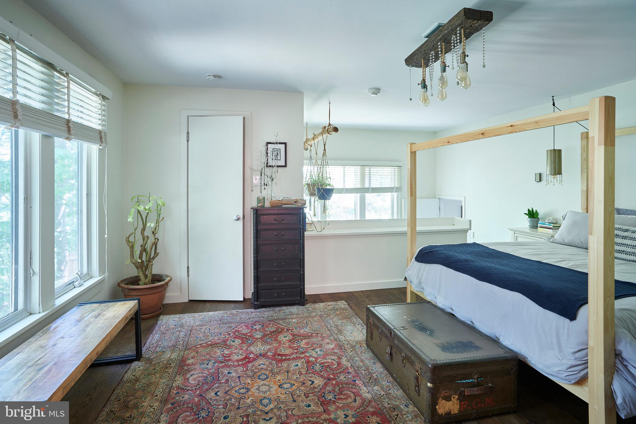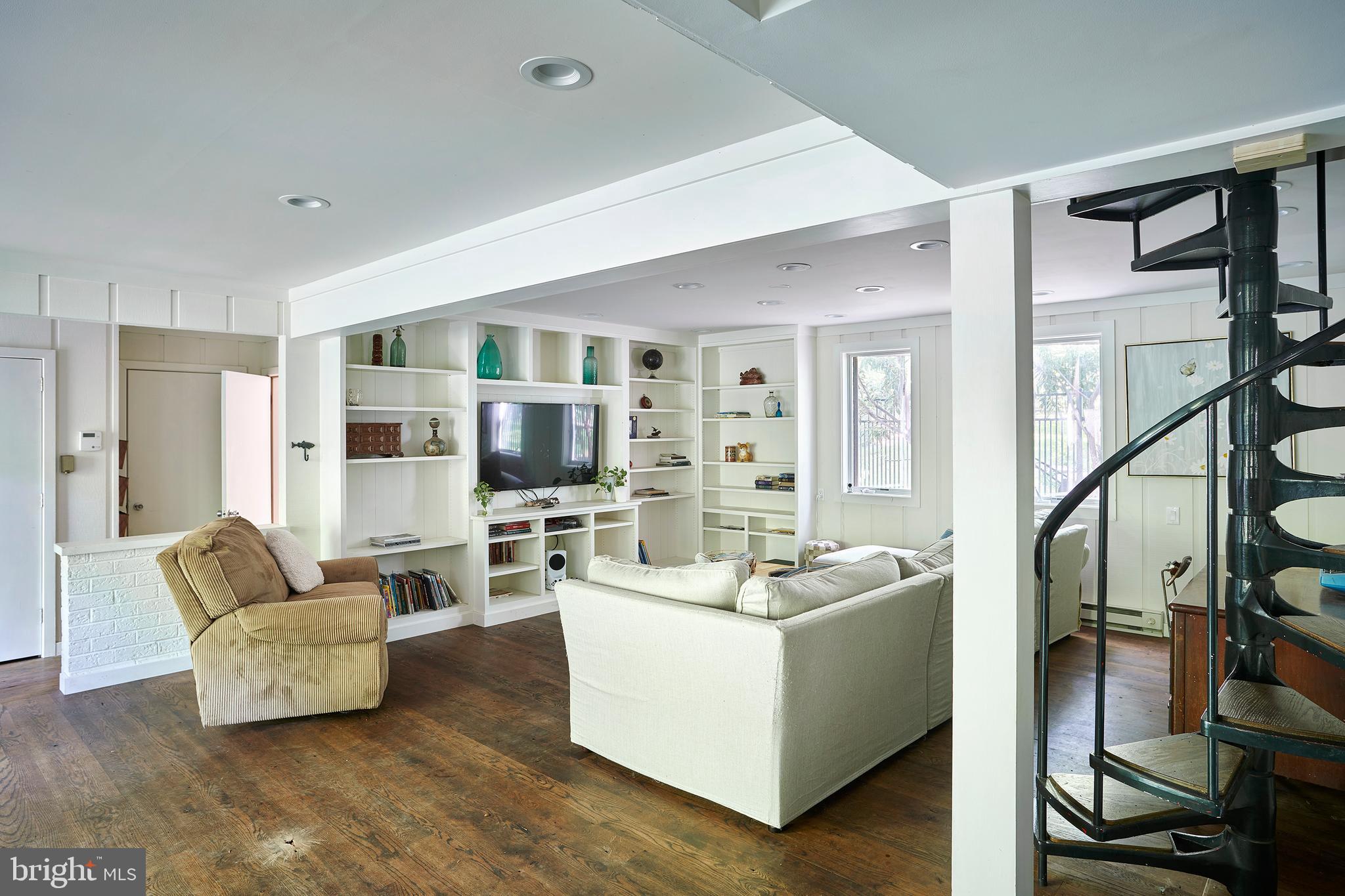 This ultra-private Mid-Century Modern home is beyond unique offering dramatic lines on the exterior with beautiful hardwood floors and a highly functional floor plan on the interior. You're greeted by solid Mahogany doors as you enter the bright and spacious living room with Rumford Fireplace(gas controlled including remote and thermostat setting), open to the 2 story dining room with fabulous floating staircase. The spectacular custom kitchen offers a large island with butcher block top, stainless farm sink, Quartz countertops, and stainless appliance suite. The open floor plan features a spacious family room, 24 x 16 with many built-ins and a spiral staircase (2nd stairway), plus a convenient half bath, guest room and laundry. Upstairs there are 4 bedrooms, an office, and 2 full baths including the primary bedroom suite. It's your own retreat with a walk-in closet, sitting area. The attached primary bathroom is finished with a lovely Santa Barbara pattern tile floor with large travertine tiled shower, a large soapstone walk-in shower as well as a separate soaking tub.